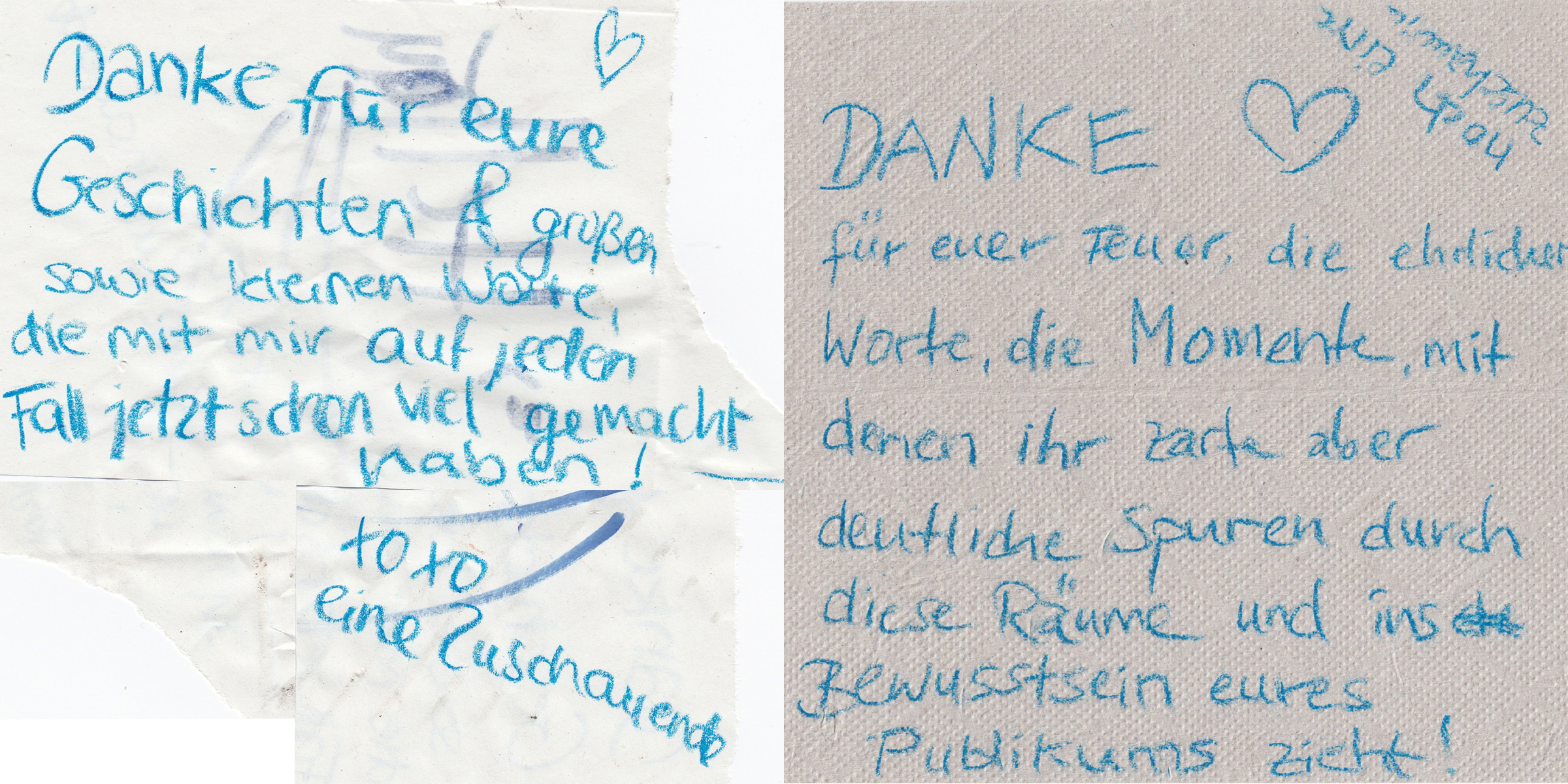 danke für die tolle Resonanz auf unser Stück. Euer Feedback ist für uns ungeheuer spannend – was habt ihr wo entdeckt, wer hat welche Geschichten erlebt, wie setzt sich für euch der rote Faden zusammen – toll! Und dass uns zwei von euch sogar kleine Zettelchen hinterlassen haben, war heute vor Aufführungsbeginn ein großer Energiebooster : )