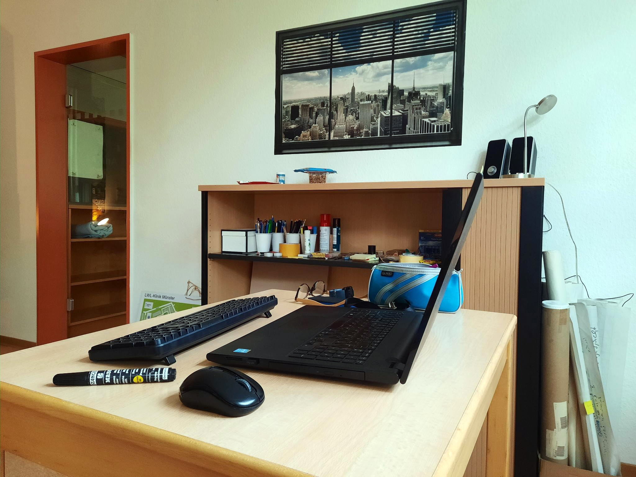 So langsam sieht unser Büro wie ein echtes Büro aus. Wir haben jetzt Tische, Bürostühle, ein Regal mit abschließbarer Schiebetür und sogar eine kleine Couch. Das heißt, wir sind nicht nicht mehr nur funktional unterwegs, sondern es wird tatsächlich gemütlich. Wenn ihr also zufällig in der Nähe von Haus 26 auf dem Klinikgelände seid, kommt auf einen Kaffee vorbei – wir freuen uns!