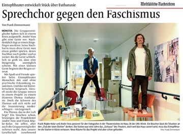 „Aktuell steckt die Gruppe mitten in einem Projekt zu einem düsteren Thema: Euthanasie. Doch die Schwere des Themas soll sich nicht auf die Inszenierung niederschlagen – im Gegenteil. (…) Es wird eine chorische Inszenierung, ein Sprechchor gegen den Faschismus, der die Kraft der Gemeinschaft nutzt und spürbar macht. Und weil [die beiden Leiter André Voss und Frank Röpke-Kolar] Anhänger des Absurden Theaters sind, haben sie auch nach dem Humor in der Thematik gesucht – auch wenn mancher Lacher im Halse steckenbleiben wird.“