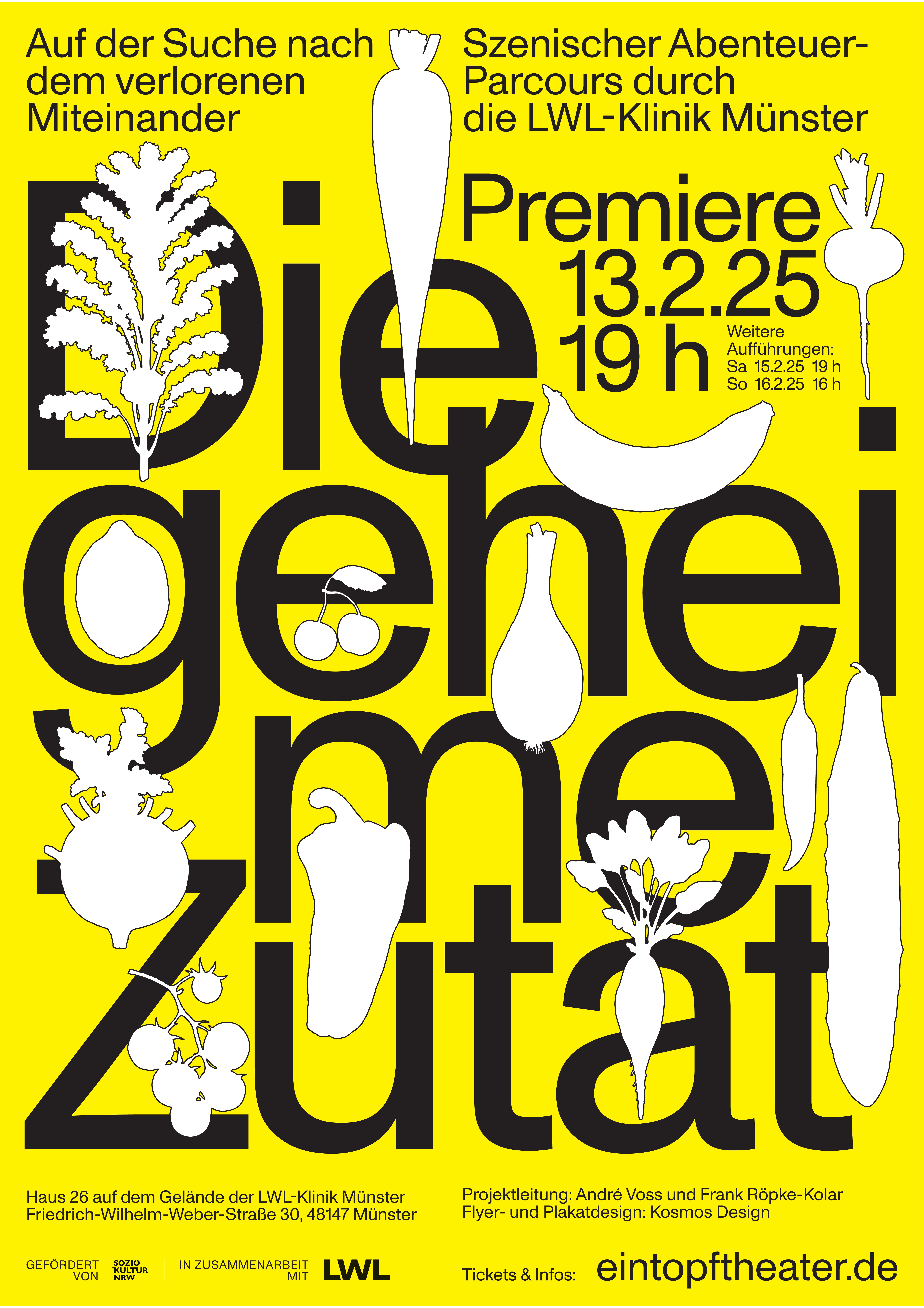 Wenn ihr als Zuschauer:innen auf der Suche nach dem verlorenen Miteinander dabei sein möchtet, dann könnt ihr ab sofort Karten für unsere neue Produktion „Die geheime Zutat“ reservieren. Die Premiere findet am Do 13.2.2025 um 19 Uhr statt. Weitere Aufführungen gibt es am Sa 15.2. ebenfalls um 19 Uhr sowie am So 16.2. um 16 Uhr. Wir freuen uns darauf, euch zu sehen!
