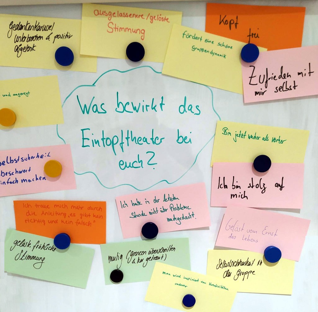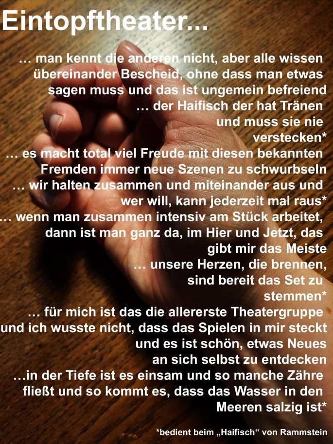Wir haben gefragt, was euch das Eintopftheater gibt. Was die Teilnahme an einem unserer Projekte gebracht hat. Was für euch das Besondere an unserer gemeinsamen Zeit war bzw. vielleicht immer noch ist.