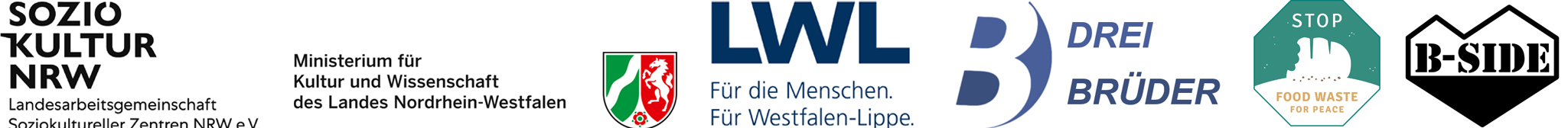 Gefördert von der Landesarbeitsgemeinschaft Soziokultur NRW und dem Diversitätsfonds NRW. In Zusammenarbeit mit der LWL-Klinik Münster, der B-Side Kultur e.V., Stop Food Waste for Peace und Drei Brüder – Lösungen aus einer Hand.